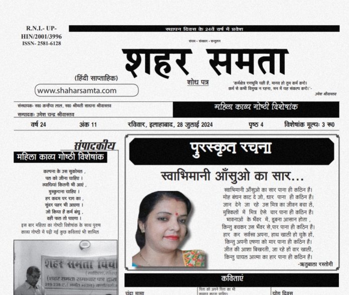 लेख और कविताएंविचार मंच व काव्यगोष्ठी महिला काव्य गोष्ठी विशेषांक | साप्ताहिक (28 जुलाई से 3 अगस्त 2024) By shaharsamta - 2 August 2024 0 417 FacebookTwitterPinterestWhatsApp शहर समता – 28 जुलाई से 3 अगस्त 2024Download