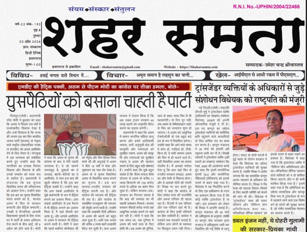 समाचार E Paper । 2 अप्रैल 2026 By shaharsamta - 2 April 2026 0 157 FacebookTwitterPinterestWhatsApp 02 apr- Shahar SamtaDownload